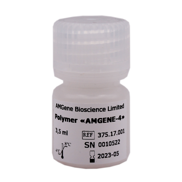 AMGENE-4 polymer is a high-tech polymer matrix for fragment analysis and sequencing, optimized for forensic DNA analysis. In terms of its viscosity and resolution characteristics, it is fully comparable to POP4 polymer (Applied Biosystems).