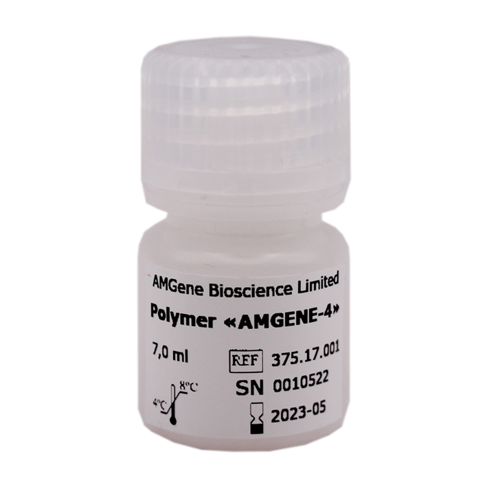 AMGENE-4 polymer is a high-tech polymer matrix for fragment analysis and sequencing, optimized for forensic DNA analysis. In terms of its viscosity and resolution characteristics, it is fully comparable to POP4 polymer (Applied Biosystems).